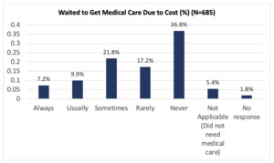 Significant barriers to care were also identified. More than a third of the respondents indicated that they at least sometimes delayed seeking medical care due to cost (Figure 3). Furthermore, 37.2% of participants had food insecurity based on the screening tool The Hunger Vital SignTM (Figure 4).6