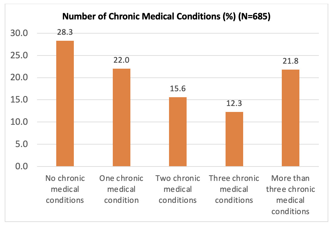 The prevalence of diabetes in the surveyed population was 16.5%. In addition to diabetes, respondents reported other chronic health conditions, with 21.8% reporting that they have more than three chronic conditions (Figures 1 and 2). Diabetes, hypertension, cardiovascular disease, cancer, and mental health/domestic violence were the top five conditions the communities wanted to learn more about.