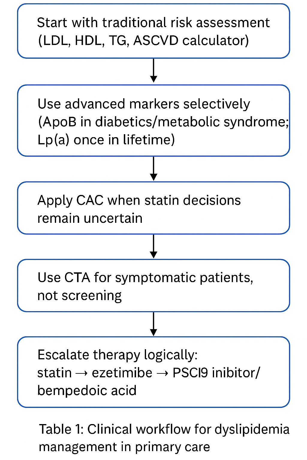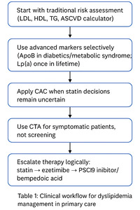 A practical workflow is described below in table 1: Start with traditional risk assessment (LDL, HDL, TG, ASCVD calculator). Use advanced markers selectively (ApoB in diabetics/metabolic syndrome; Lp(a) once in lifetime). Apply CAC when statin decisions remain uncertain. Use CTA for symptomatic patients, not screening. Escalate therapy logically: statin → ezetimibe → PCSK9 inhibitor/bempedoic acid. Treat to appropriate intensity, not just numbers.