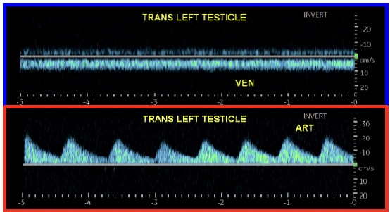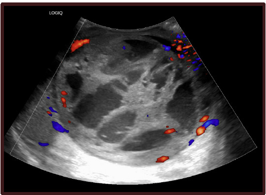 Physical examination revealed diffuse enlargement of the left hemiscrotum compared to the right, without overlying skin discoloration. Palpation of the left testicle demonstrated firmness without abnormal warmth, erythema, or tenderness. Given these findings, point-of-care scrotal ultrasound was performed, which demonstrated marked enlargement of the left testicle measuring approximately 9.0 x 10.0 cm compared to the contralateral right testicle measuring approximately 8.0 x 9.0 cm, without evidence of hydrocele or torsion. The left testicle demonstrated heterogeneous echogenicity with complex cystic areas and internal vascular septations (Figure 1). Duplex imaging further demonstrated preserved arterial and venous waveforms (Figure 2), helping exclude torsion and supporting intratesticular pathology.