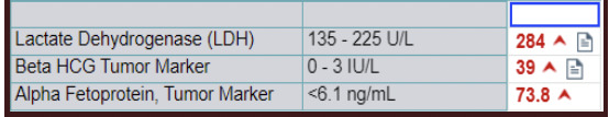 The patient was advised to seek emergent evaluation, and subsequent imaging at the emergency department confirmed a 9.9 cm complex cystic mass with thick vascular septations replacing the left testicle, highly concerning for primary testicular malignancy. Serum tumor markers were elevated, including beta-human chorionic gonadotropin (β-hCG) at 39 IU/L (reference range: 0-3 IU/L) and alpha-fetoprotein (AFP) at 73.8 ng/mL (reference range: <6.1 ng/mL), and lactate dehydrogenase (LDH) at 284 U/L (reference range: 135–225 U/L) (Figure 3). Cross-sectional imaging demonstrated no evidence of metastatic disease in the chest, abdomen, or pelvis. The patient subsequently underwent left radical orchiectomy with testicular prosthesis insertion via a left inguinal incision in October 2024 without complication. Pathologic evaluation confirmed a mixed germ cell tumor measuring 9.8 x 8.0 x 7.0 cm, composed of teratoma (approximately 10%), embryonal carcinoma (approximately 85%), and yolk sac carcinoma (approximately 5%). Postoperative follow-up demonstrated appropriate surgical recovery. Staging workup revealed no evidence of metastatic disease, and the patient was referred to medical oncology for further evaluation and discussion of adjuvant management.